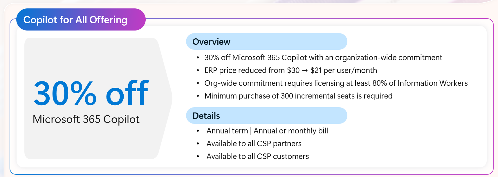 Bis zum 30. Juni 2026 bietet Microsoft Unternehmen, die Microsoft 365 Copilot für den Großteil ihrer Information Worker (IW) skalieren möchten, einen Rabatt von 30%. Die Promotion ist in CSP für jährliche Subskriptionen von Microsoft 365 Copilot verfügbar.