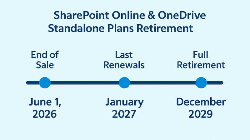 À compter du 1er juin 2026, Microsoft cessera de vendre ses abonnements autonomes SharePoint Online et OneDrive for Business Plan 1 et Plan 2. Ce changement marque le début d’un retrait progressif : les clients existants peuvent continuer à renouveler ces plans autonomes jusqu’en janvier 2027, et tous les plans autonomes SharePoint Online et OneDrive for Business seront entièrement retirés d’ici décembre 2029.