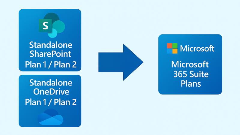 Les plans SharePoint Online et OneDrive for Business autonomes étant retirés, les organisations devront passer à l’octroi de licences pour ces services par le biais d’abonnements à Microsoft 365 ou de nouveaux modules complémentaires de stockage. À l’avenir, SharePoint Online et OneDrive ne seront disponibles que dans le cadre d’offres groupées plus larges de Microsoft 365. Cela signifie qu’au lieu d’acheter SharePoint ou OneDrive en tant que licences Plan 1/Plan 2 séparées, les clients doivent passer à un plan Microsoft 365 qui inclut ces services :