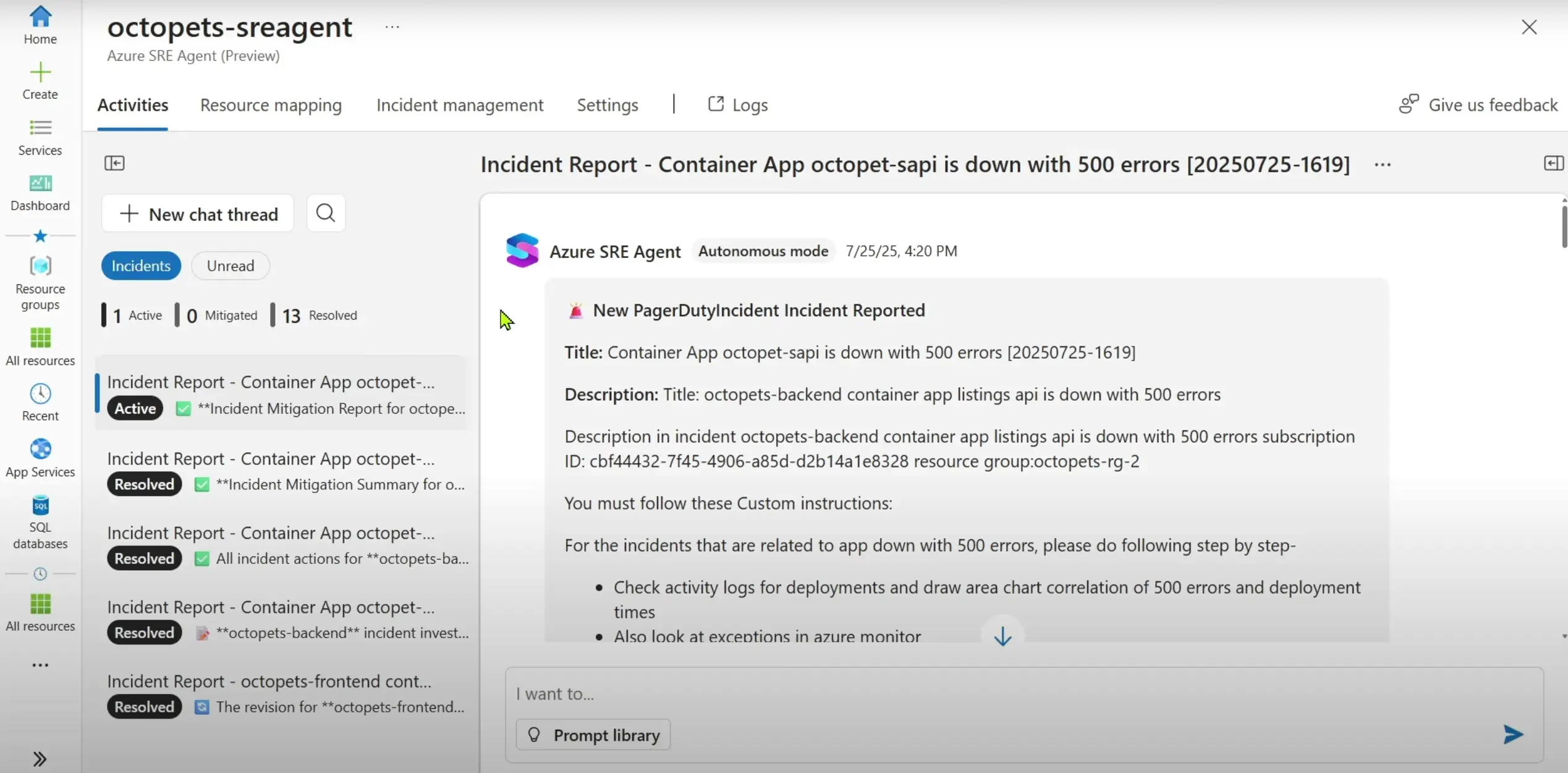 - Automated Incident Response: When an incident or anomaly occurs, Azure SRE Agent automatically engages in incident response. Thanks to built-in AI, it can diagnose the issue (identifying, for example, which microservice or component is failing) and then take action to remediate. Common actions include scaling up a resource, cycling a service, or applying a known workaround. This reduces downtime since the agent can often resolve problems in seconds.