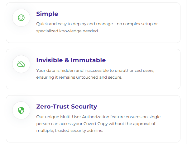 - Prevents ransomware and insider threats from seeing or modifying recovery data