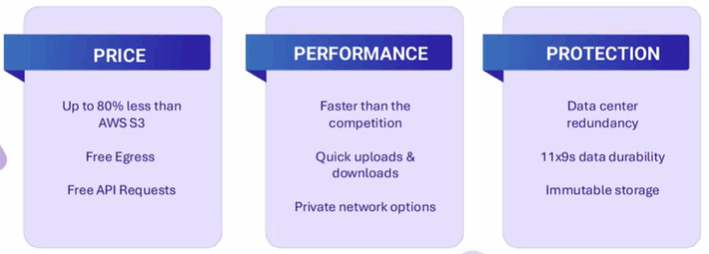 - Flat, predictable pricing per TB with no egress fees and no API charges.
